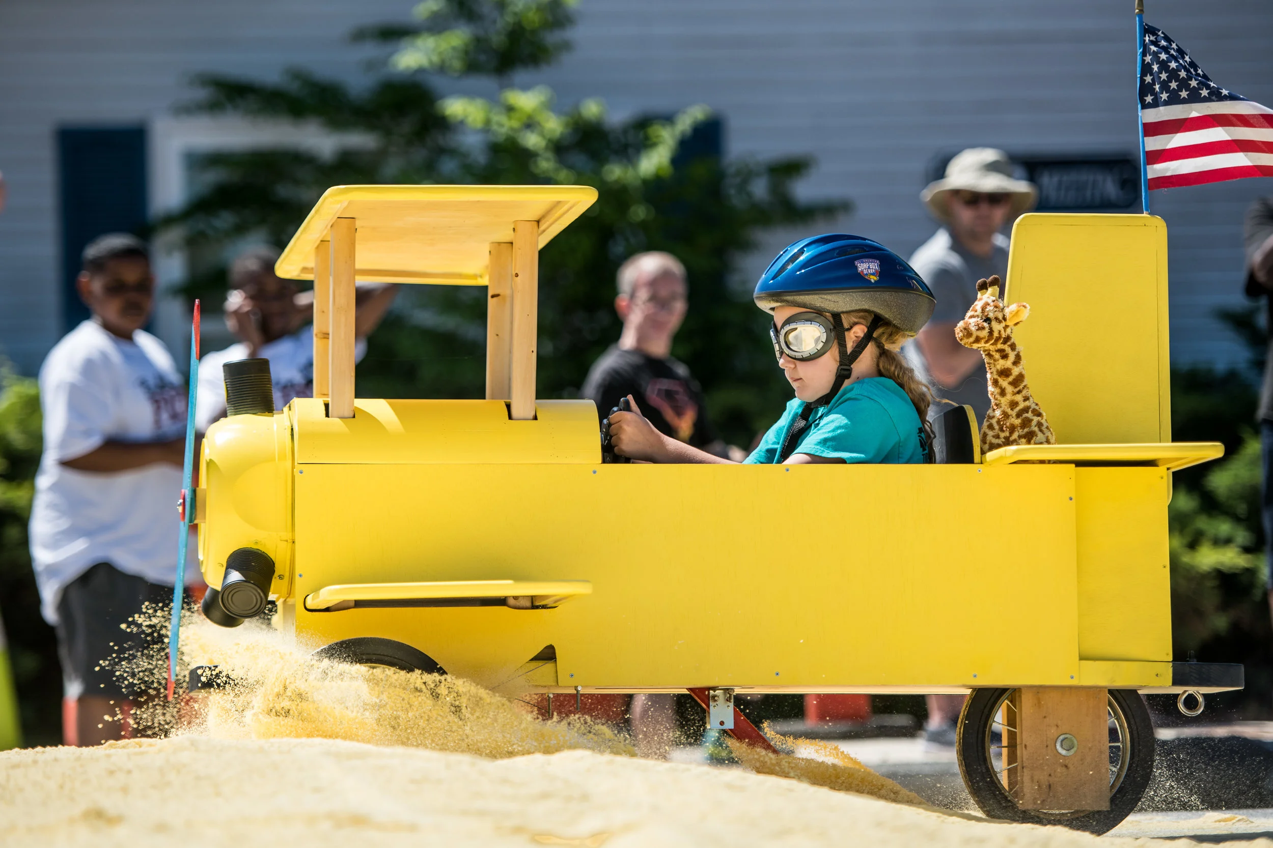 Indeed, there were more grits flying this year at the second annual West Columbia Kinetic Derby Day. With strategic placement of the speed reduction mechanism, evident on the first run when car #17 blasted through the golden heaps of mashed corn and scattered photographers and fans behind the finish line - and improved logistics on the derby vehicle return, the event moved along at a much improved and entertaining pace.