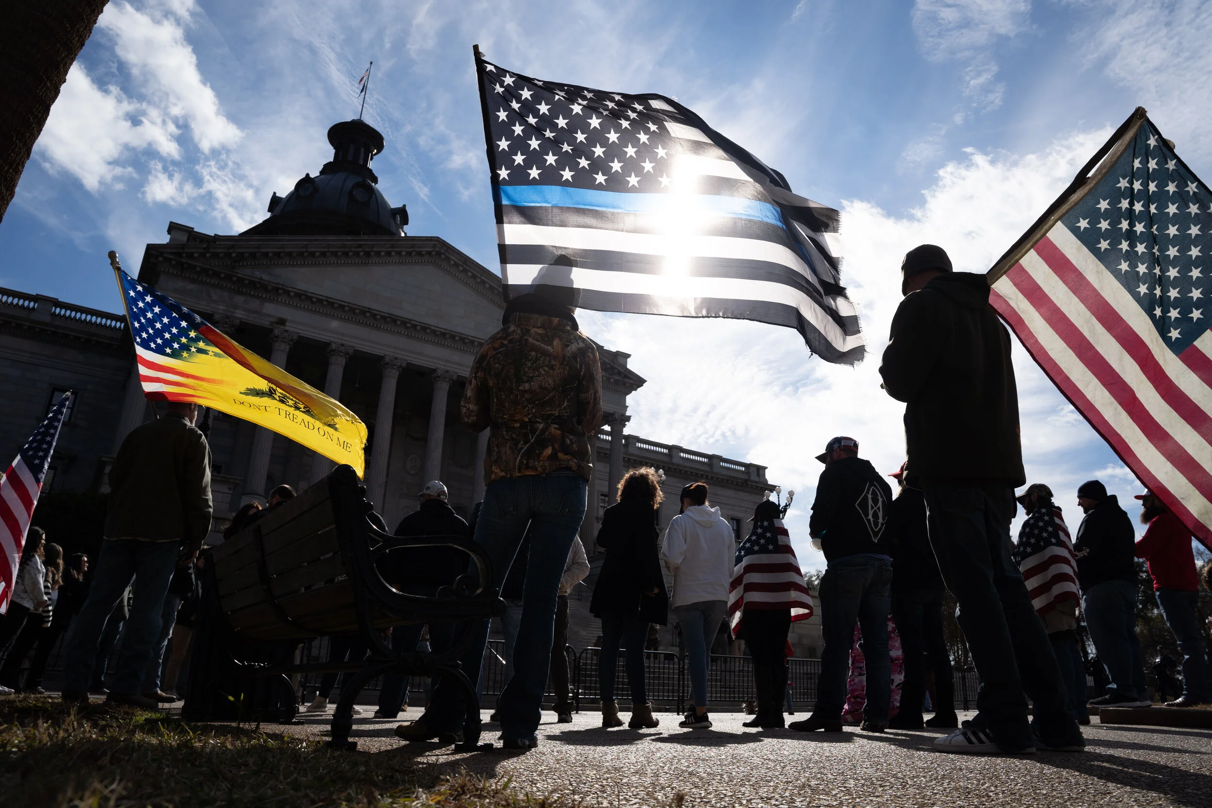 With unprecedented domestic terror alerts at all fifty state capitols, Quinn is one of many speakers to address about 30 demonstrators gathering at the South Carolina Statehouse January 18. Law enforcement outnumber demonstrators, the majority convoying from Florence, SC, home of rally organizer Shawn B Laurie.