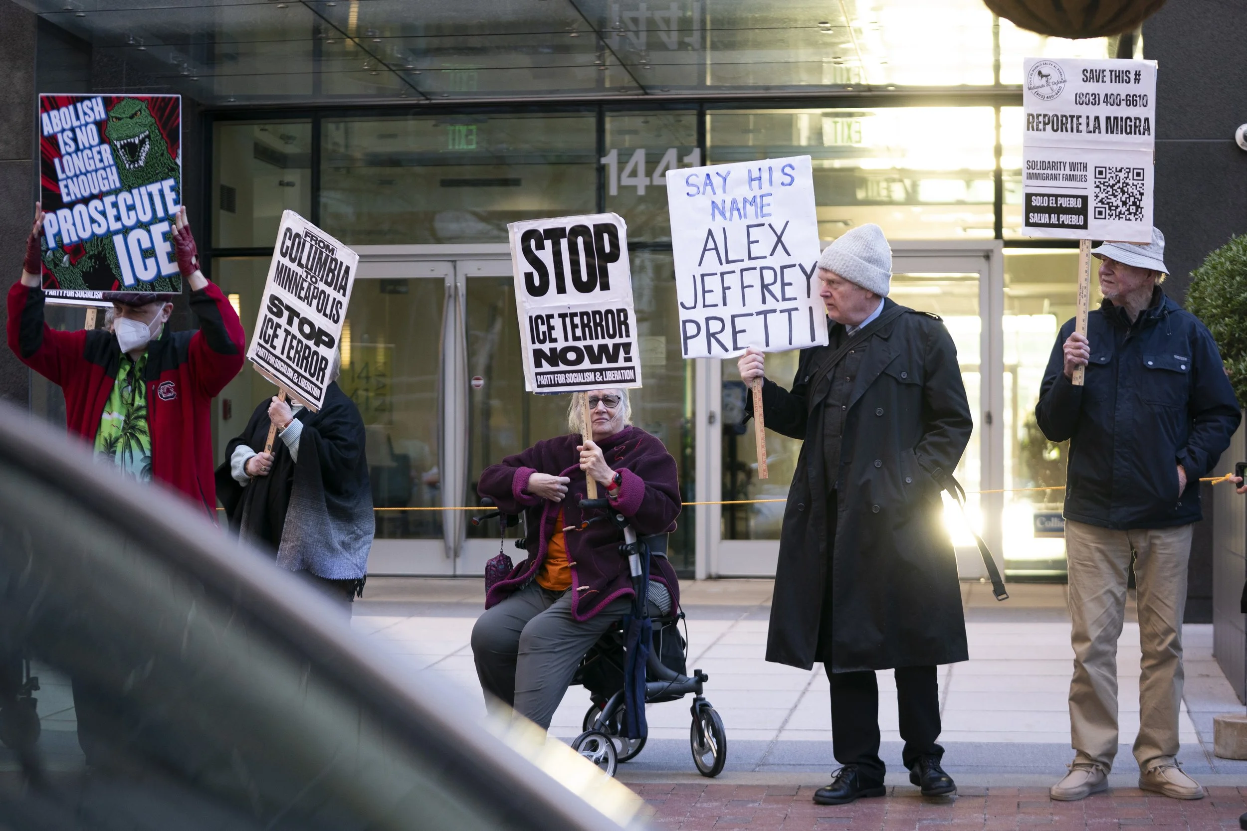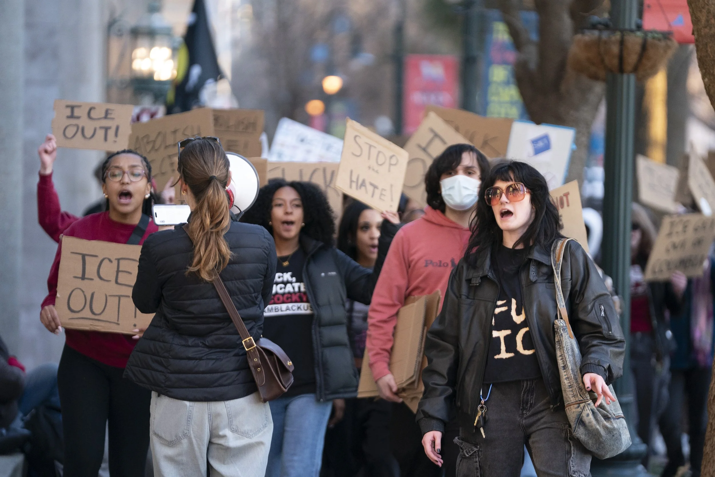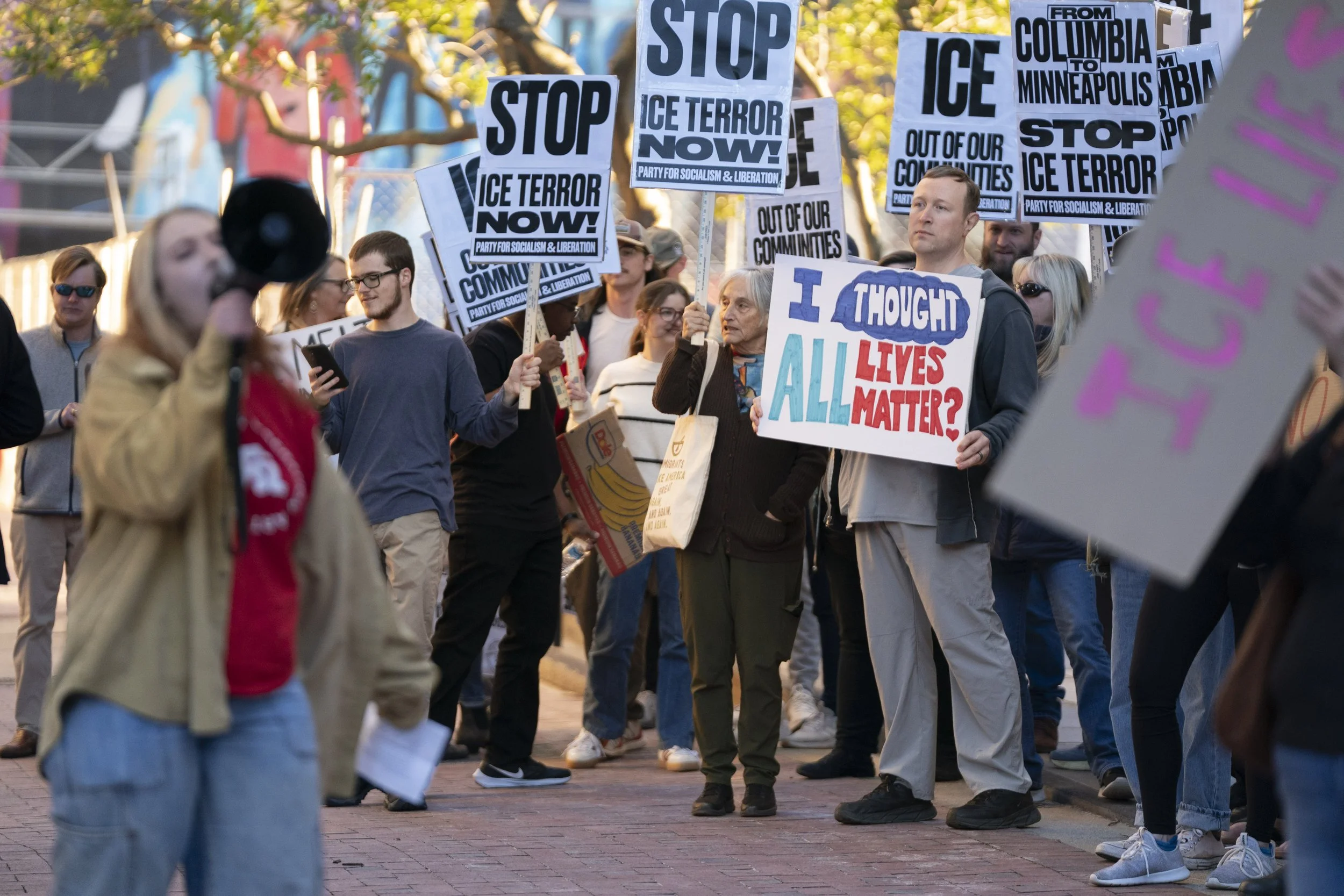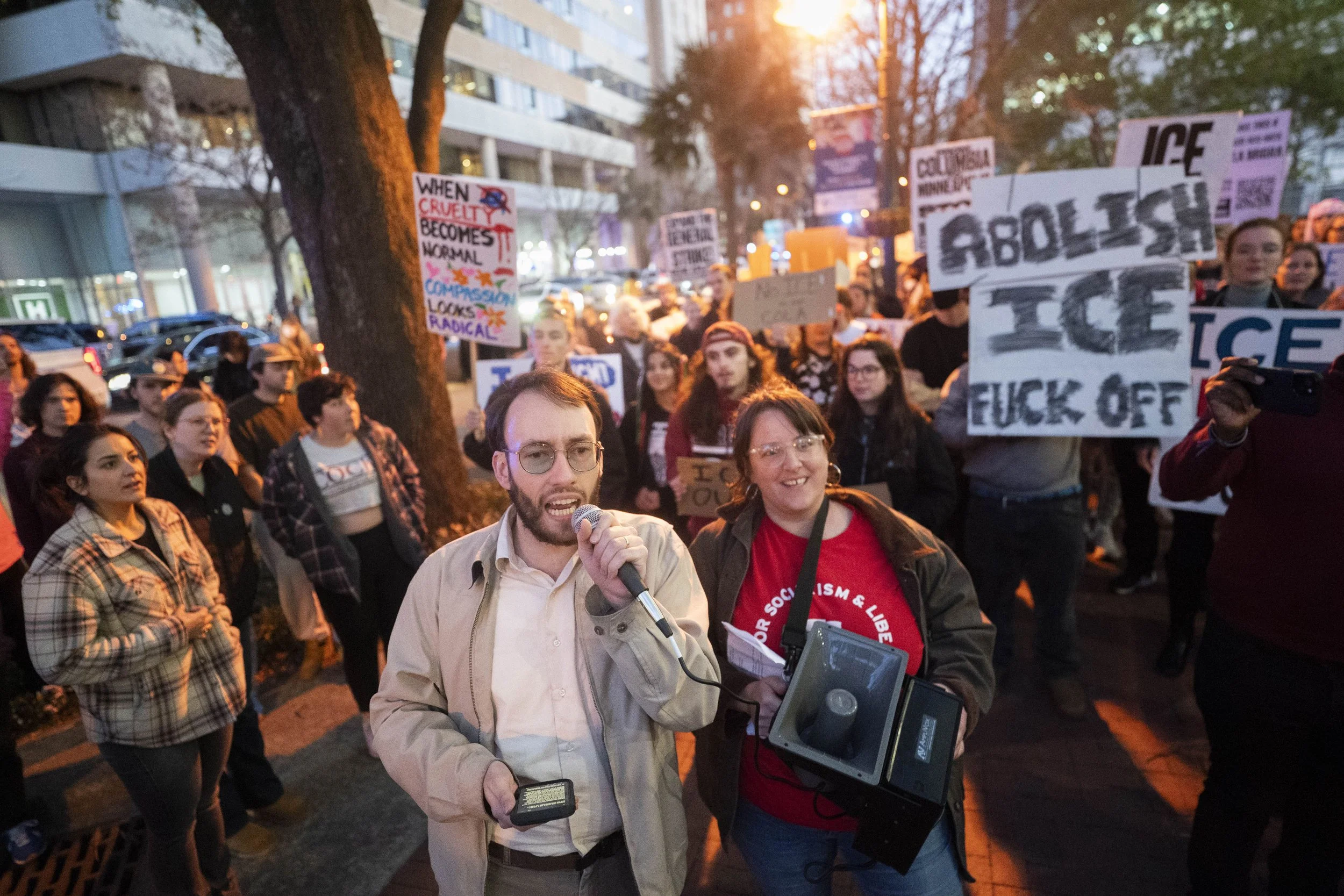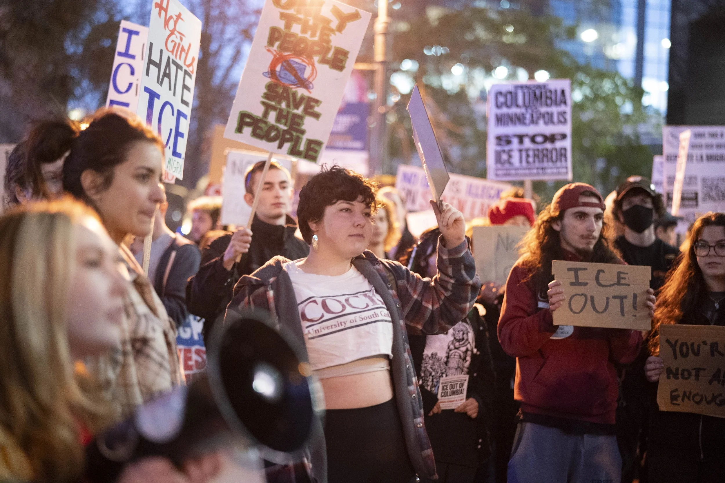 Students from the University of South Carolina came in number, marching down the Main St sidewalk on Friday evening in Columbia, South Carolina. Their arrival, signaling young organized reinforcements, elicited cheers from the protestors already standing outside 1441 Main St., a new home for an ICE legal facility and a surprise to the local community and its leaders.