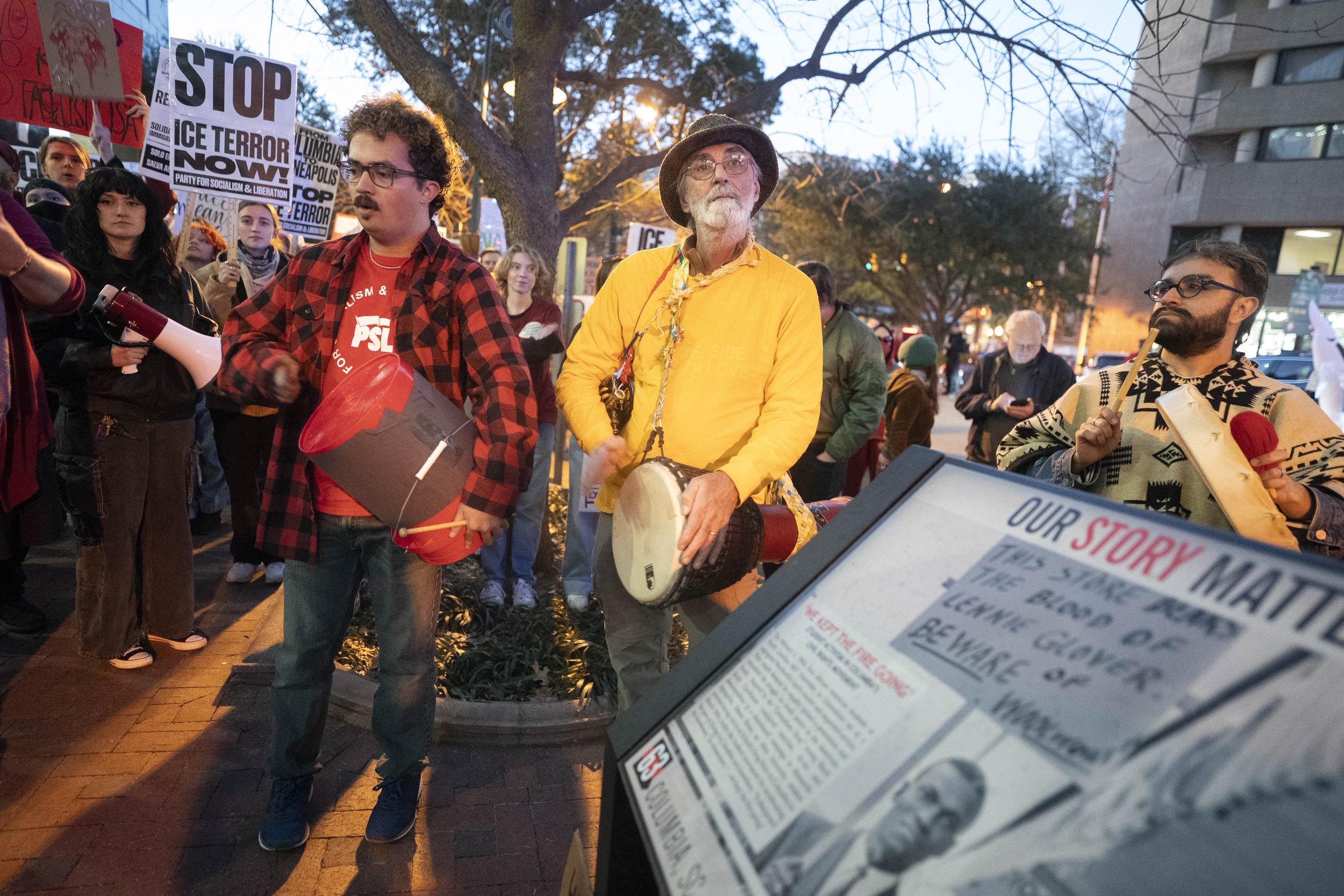 One of them wielded an upside down dresser drawer as a drum. And along with several other musicians, the beat of the protest bounced off the downtown facades.