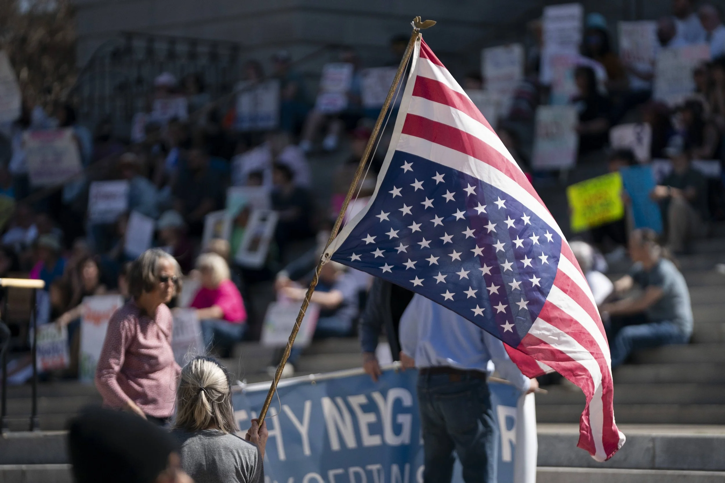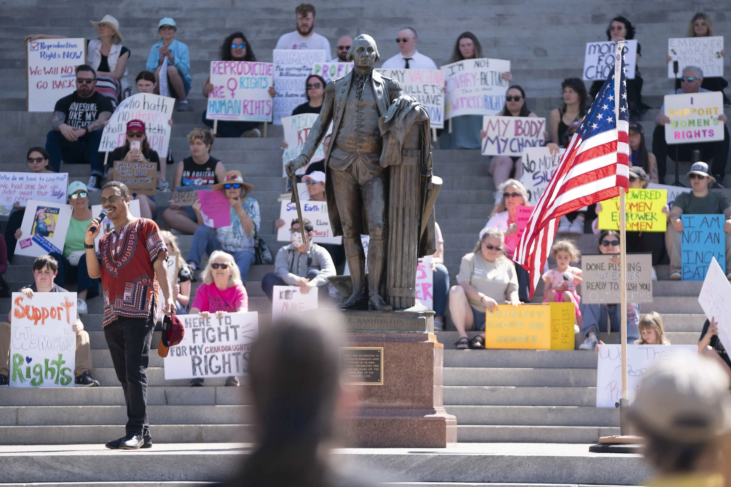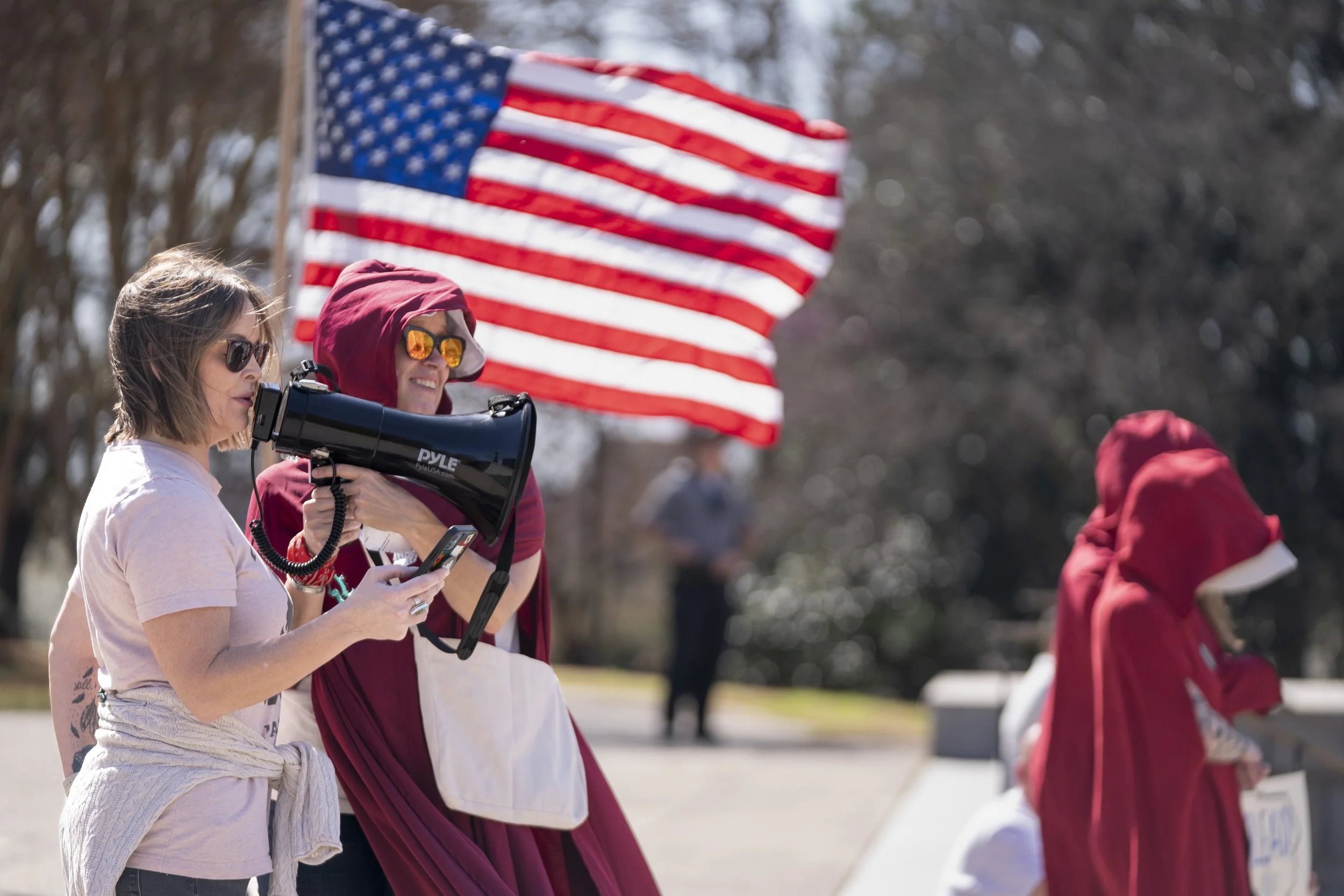 Holding a bullhorn for Wood, Julie Zimmerman, network coordinator for the Midlands area 50501 organization, said the purpose of the rally was to highlight women’s issues.